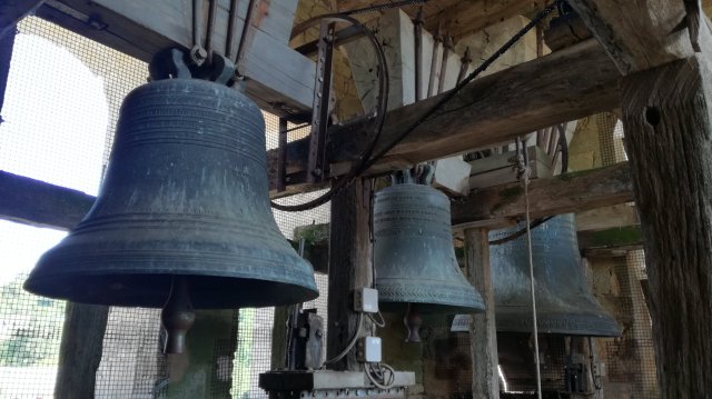 Achter een deurtje tref ik een wenteltrap. Er hangt een briefje waarop gevraagd wordt het licht uit te doen en de deur achter je te sluiten. Hieruit maak ik op dat we naar boven mogen klimmen. En dat doen we. Tot bij de klokken en zelfs nog een verdieping hoger!