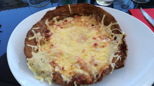 Ik krijg eerst een verrukkelijke salade verte met lardons en stukjes gemarineerde kalkoen voorgeschoteld. Mijn hoofdgerecht is une pascade: het is iets tussen een pannenkoek en een omelet in, en ze is belegd met spekjes, crème fraîche en geraspte kaas. Het doet me denken aan een Yorkshire pudding! De kok komt uitleg geven en begrijpt heel goed die vergelijking. Hij vertelt dat het een authentiek boerengerecht uit de Aveyron is, en er zijn bij zijn weten maar twee restaurants in het département die het op de kaart zetten. Ik snap dat niet, want het is echt héél lekker!!!