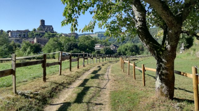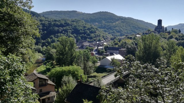 We keren terug op onze schreden en nemen een ander pad, omhoog. Monsieur Assie heeft gezegd dat we moeten uitkijken naar een smal paadje. Net voor we een asfaltweg bereiken, ontdek ik het. Echter, we zijn inmiddels zó bezweet dat we besluiten om niet verder te gaan. We maken het rondje (1 km) af, en dalen over een oud, stenig pad af naar de brug. Het uitzicht over het dorp is mooi, helaas hebben we zo vroeg op de dag tegenlicht.