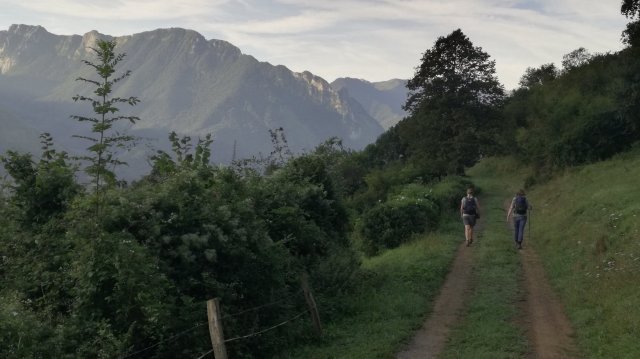 We bevinden ons vrij hoog en zien dat de valleien ten zuiden van ons in de wolken zitten; hier en daar steekt er een topje of een bergruggetje bovenuit. De jongere dame bevestigt dat alles ten zuiden van de Pyreneeën onder een dik wolkendek is verborgen… Opeens komen er door de vallei onder ons óók wolkjes aanrollen.