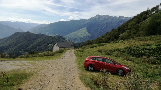 Na een korte stop bij een vervallen watermolen in Osse-en-Aspe rijden de oudere dame en ik naar de Col de Houratate (1009 m) en vandaar over een asfaltweggetje, de naam nog amper waardig want vol scheuren en kuilen, naar de Col de Berghout.