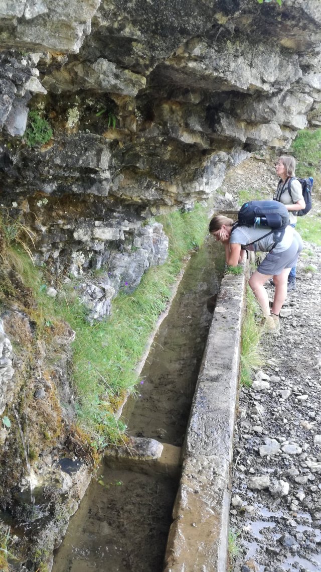 We wandelen de jongere dame tegemoet, ze heeft inmiddels de top bereikt en is aan de afdaling begonnen. Na een kleine kilometer lopen, genietend van het uitzicht en de bloemen, ontmoeten we elkaar bij de Fontaine Mayou. We vallen elkaar in de armen en bewonderen het leven in de drinkbak bij de fontaine: salamanders en rondwormen – vreemde wezens, die laatste, in eerste instantie denk ik dat er stukjes dun touw in het water liggen, tot ze opeens gaan bewegen! We verorberen de meegebrachte lunch.