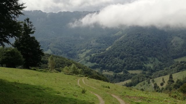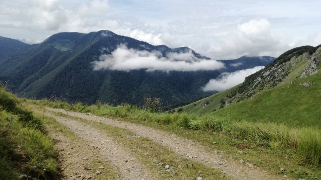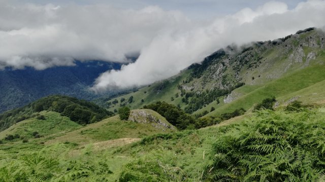Onze twee recente ervaringen indachtig, heb ik diep respect gekregen voor mist in de bergen! We besluiten om weer terug richting de auto te lopen. De jongere dame zet er de pas in, want zij gaat helemaal afdalen naar Athas en Osse-en-Aspe. De oudere dame en ik lopen op ons gemakje naar de pas. Achter ons verdwijnt een groot deel van het landschap in de wolken, maar ook de hoge bergen op de Frans-Spaanse grens worden opgeslokt!