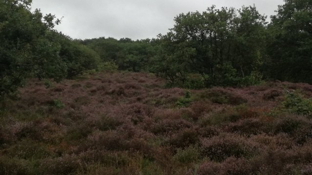 Het regende zachtjes. Ik denk dat we de enige wandelaars waren… Het was stil in het duin. Al gauw passeerden we een paar plekken waar hei groeit en zou moeten bloeien… Wat schrok ik: de heide ziet er niet uit! De hete zomer eist zijn tol!!