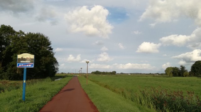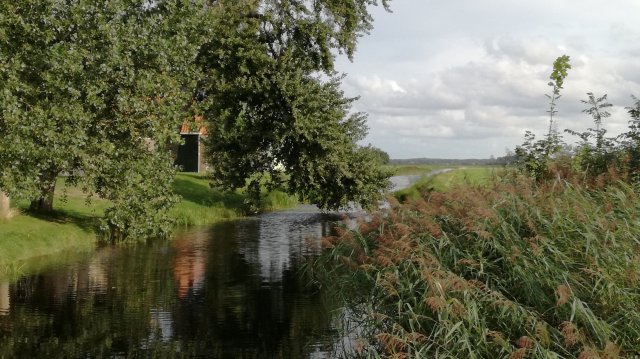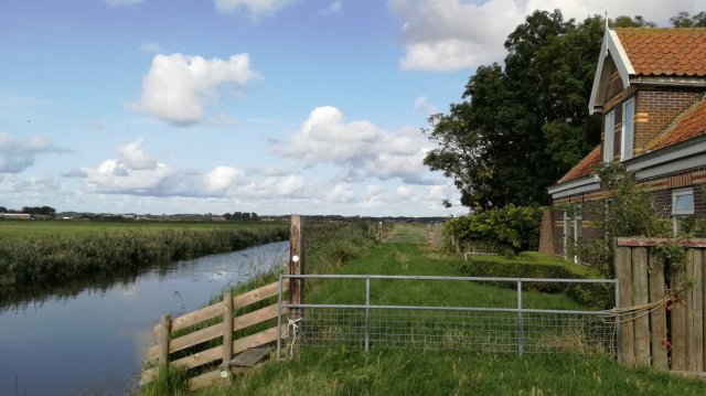 Helaas duikt de zon tijdelijk achter wat binnendrijvende wolkenvelden. Gedurende ongeveer een kilometer wandel ik over de grasdijk, en met enige regelmaat gebruik ik de overstapjes die zijn aangebracht. Sommige hangen boven het water, andere zijn rijkelijk omringd met brandnetels.