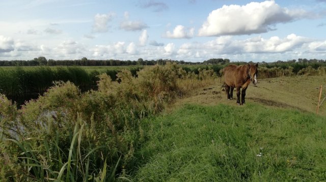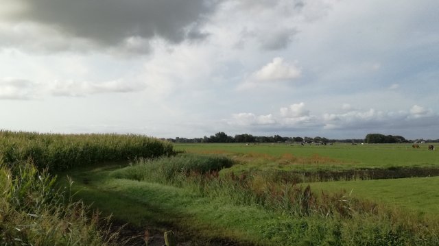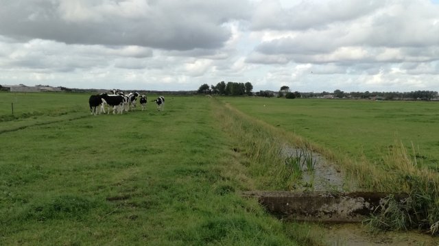 Bij een boerderij loop ik het grasland in. Het is een smal, langgerekt perceel tussen twee slootjes. Ik ontwaar in de verte tegenliggers!