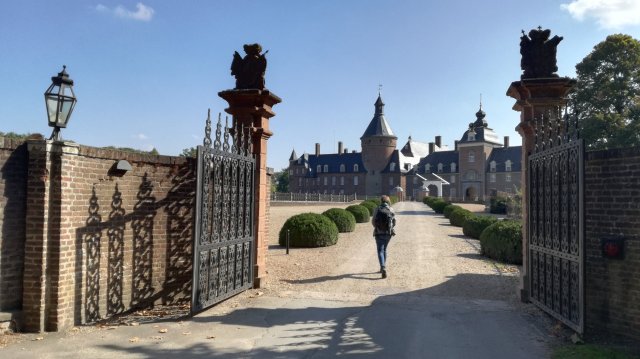 We kuieren er wat rond en drinken een kopje koffie in het Parkhotel dat is gevestigd in het kasteel. Op de binnenplaats staan slanke, glimmende Mercedessen waaruit duur geklede heren en dames verschijnen; een tournedos kost er 72 euro. Kortom, een dure koffie. Maar niet getreurd want de locatie is verrukkelijk en het herfstzonnetje is volop van de partij.