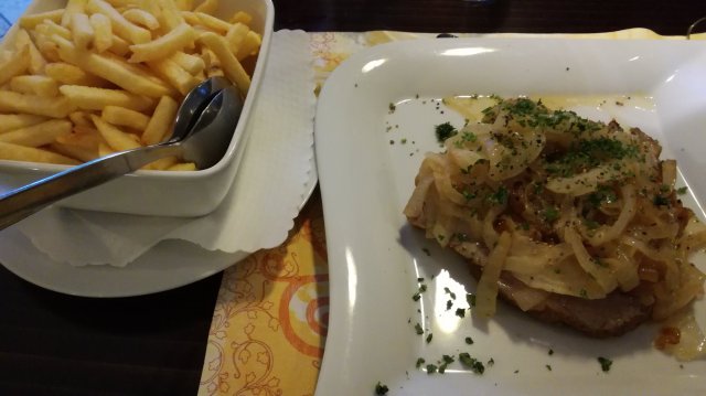 In Waldfriede gaan we aan de Duitse kost… Schweinefleisch, zwiebelen, pommes, salat. Eis. Tomatensuppe voraf. Dunkeles weizen Bier, trocken Riesling. Mein Deutsch ist nicht do gut!