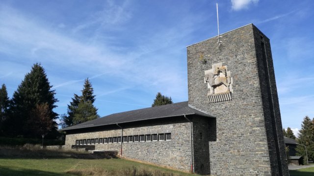 Vandaag lopen we naar Vogelsang: door de Nazi’s gebouwd op een hoge heuvelrug boven het dal van de Urft, als trainingskamp voor elitesoldaten; na de oorlog, tot 2005, een kazerne van de Belgische Strijdkrachten in Duitsland (BSD). We lopen er langs een gebouw waar het oude CMC-bord met toegangstijden en al nog aan de gevel hangt. In vier talen staat er ook dat je alleen ongewapend de winkel mocht betreden…