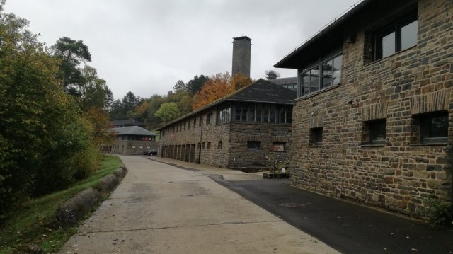 Na de lunch lopen we nog een tijdje rond over het immense terrein. Gisteren liepen we hier ook maar we hadden eigenlijk geen idee van welk aandeel Vogelsang heeft gehad in de Duitse geschiedenis. Met andere ogen kijken we naar de onderkomens voor de soldaten, het sportveld, het zwembad, de turnzaal enz.