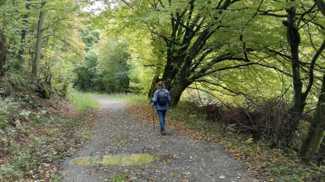 Het is droog en ik heb behoefte aan frisse lucht. We pikken de Eifelsteig op en wandelen door herfstig bos naar Wollseifen.