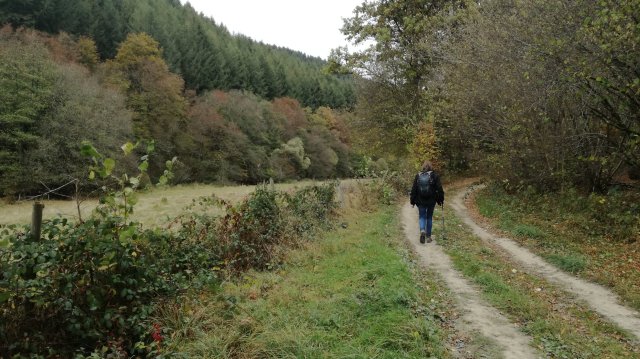We lopen door de Drohnvallei en volgen het riviertje een hele tijd stroomopwaarts. De herfstkleuren zijn alom aanwezig, wat jammer dat de zon niet van de partij is…