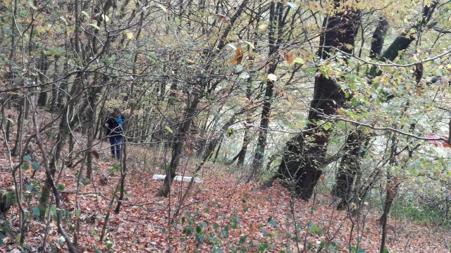 Er volgt nu een stukje ongebaande route want het pad is met bramen overwoekerd: we bunkeren door het bos omhoog waar ergens een asfaltweggetje moet lopen.