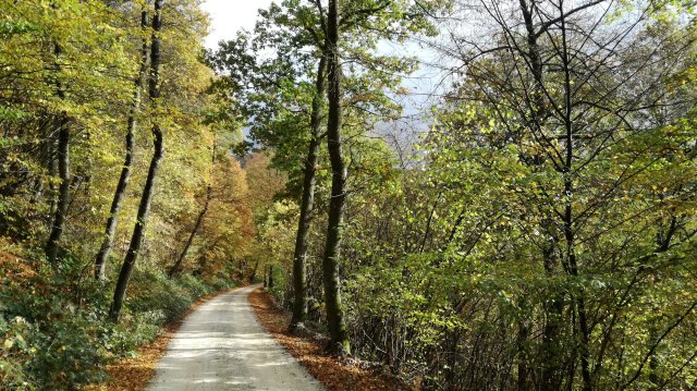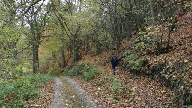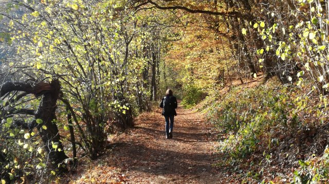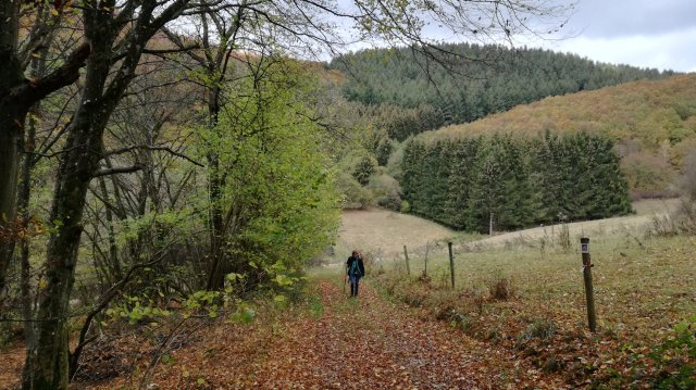 We genieten van de heerlijke boslucht en de uitbundige herfstkleuren. Al tijdens de afdaling breekt het grijze wolkendek en zet de zon het bos even in brand!