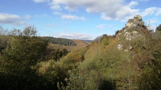 We dalen weer af naar de Dhronvallei. We komen langs de Reinhardsmühle en de Kopusfels, een enorme rotstoren midden in het bos.