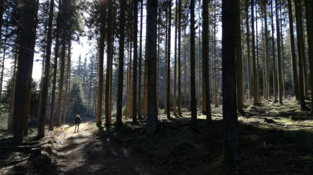 Ongeveer 1 km vóór Farnières neem ik afscheid van de beide dames, ik kies voor een kortere route terug, mijn rug vraagt nog steeds om extra aandacht. Een prachtige afdaling volgt met aan één kant dicht sparrenbos en aan de andere kant een strook sierlijke beuken…