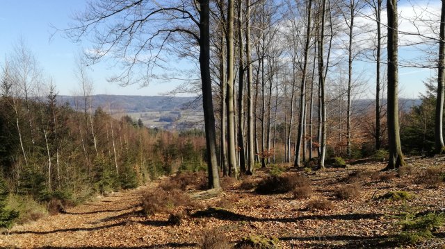 De komende kilometers voeren ons door de mooie afwisselende bossen richting Farnières. Het pad blijft min of meer op dezelfde hoogte dus het loopt heerlijk. Op een open plek in het bos zetten we ons op een paar boomstronken en werken we de meegebrachte boterhammen met kaas naar binnen. Het uitzicht is prachtig, ver en hoog aan de overkant zien we Logbiermé liggen!