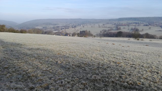 Na een heerlijk ontbijt met verse pistolekes van bakker Mahaux en een zachtgekookt eitje, stuur ik onze bolide naar Mont-le-Soie, een centre equestre temidden de Waalse bossen, jaren in stand gehouden met Europese subsidies. Vandaag duiken we de bossen in en we komen er niet meer uit… De zon verdwijnt achter flarden bewolking; hierboven (550m) is het zelfs wat mistig! En koud, 4 graden!
