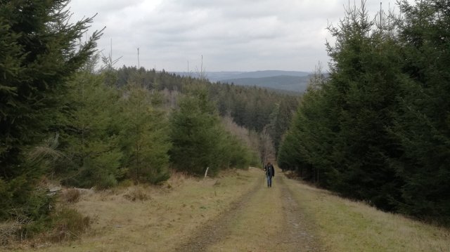 Langzaam voeren de paden ons dieper het woud in, lichtjes stijgend tot het hoogtepunt: een massief blok arduin met de inscriptie station géodesique: we bevinden ons op 599m boven de zeespiegel. De oudere dame is zo vriendelijk om te poseren.