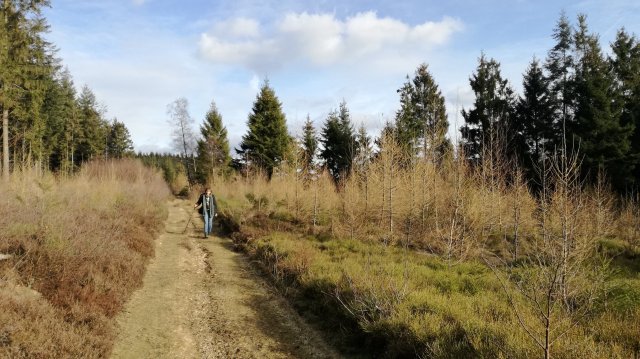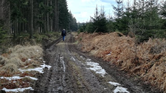 De route langs de oude grens is prachtig. We lopen hier op een plateau, vrijwel vlak en dus met beperkte afwatering wat maakt dat de paden hier ouderwets drassig zijn: zo herinner ik me de Ardennen uit mijn jeugd… Het was 1965 denk ik toen het gezin Jacobs twee weken vakantie hield in Les Gattes in Logbiermé!