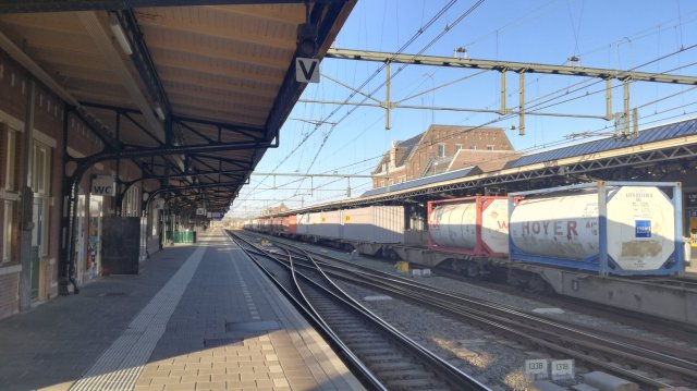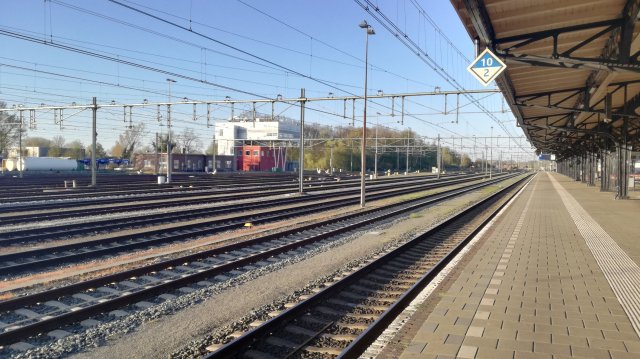 Aan de westkant van het spoor ligt wat industrie. Een vaag gedreun hangt in de lucht. Het alarmsignaal van een achteruit rijdende vorkheftruck boort door de stilte. Een kauw vliegt boven het spoor en verdwijnt achter een goederenwagon. Opeens toch het gedender van een koffer-op-wieltjes; hey, nog een reiziger. Vanuit het noorden rijdt een splinternieuwe trein binnen. Er wordt een spoorwisseling omgeroepen. Ik moet naar 4b. Hoe is het mogelijk in zo’n groot, leeg station: een spoorwisseling!? Vanuit het zuidwesten, Vlissingen vermoed ik, loopt de trein naar Den Haag CS binnen… Ik stap in. Mazzel! Een heerlijk plekje in een rustige stiltecoupé!
