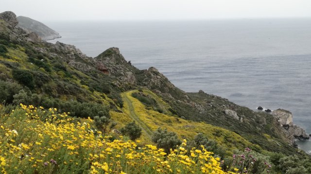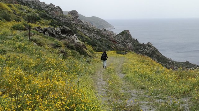 Net voorbij Vathia maken we een fotostop en zien een prachtig pad afdalen richting zee. Dat lijkt ons wel wat…