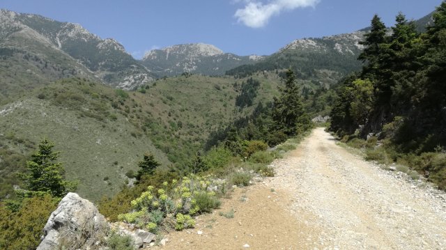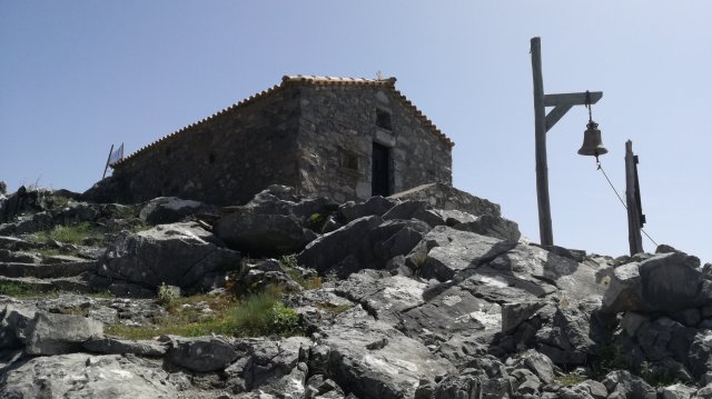 Vanaf Kastania rijden we naar Saidona en voorbij dat dorp nemen we een weg die de bergen in voert. Helaas is die al na 100 m onverhard, na 500 m zetten we de auto op een zijpad en dat volgen we naar de top van een bergje waar een kapelletje staat. In de schaduw ervan eten we wat.