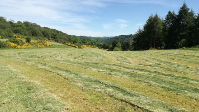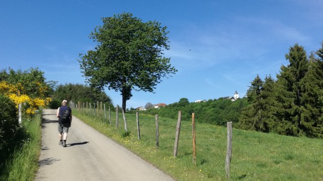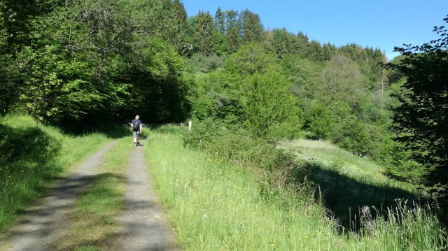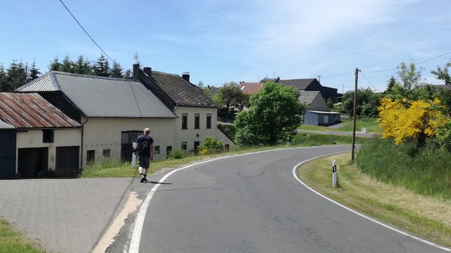 De zon brandt nu behoorlijk, gelukkig is het pad boven de Our behoorlijk schaduwrijk… We worden ingehaald door een man op een quad met een aanhangwagentje: hij controleert de bewegwijzering van de Matthiasweg. Het pad klimt tot we op een asfaltweg komen. Die volgen we – verder omhoog – tot het dorpje Affler. We hebben nu een prachtig uitzicht over het dal van de Irsen.