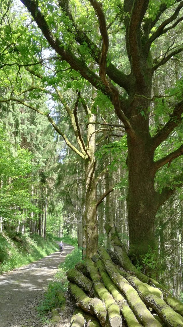 Vanaf Preischeid dalen we over een smalle asfaltweg het diepe dal van de Our in, met als bestemming het heerlijke terras van de Dornauelsmühle. We bestellen er een stuk hausgemachte appelcake; Barney drinkt er een radler bij, ik spoel het gebak weg met een Kapuziner weissbier, een van de favorieten van de uitbater (die me als beste weissbier een van een kleine brouwerij in de omgeving van München aanprijst; naam vergeten 🙄).