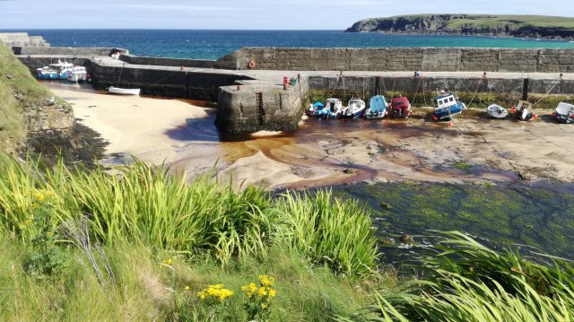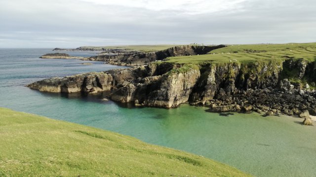 Als we aankomen in Port of Ness, is het bijna drie uur. Eerst nemen we een kijkje in de mooie omgeving: de turquoise zee, het witgele strand, het bijzondere haventje… Langzaam breekt de bewolking en komt de zon tevoorschijn! Het is 21°C en dat is op de Outer Hebrides een tropisch warme dag! Gelukkig waait het behoorlijk en dankzij de zgn. chill factor voelt het toch zo fris aan dat we een fleece kunnen verdragen!