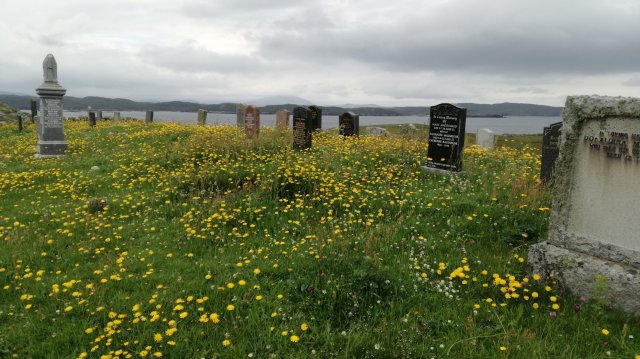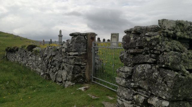 Verder dan de ruïne tegenover ons huisje kom ik niet… Vrouwlief was al eerder de deur uit en komt een tijdje later ook thuis. Tegen de middag lijken zich enkele veelbelovende scheuren in de bewolking te ontwikkelen en dat is het sein om andermaal naar buiten te gaan. Deze keer wandelen we het dorp in en bij de zwarte schuur met de groene deur nemen we het asfaltweggetje richting de zee. Na een kleine kilometer loopt het dood bij het mooie kerkhof van Tolsta Chaolais: ommuurd om de schapen buiten te houden, verhoogd om de doden droog te kunnen begraven.