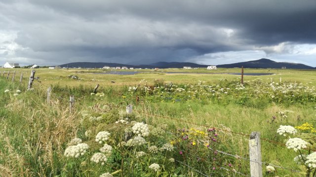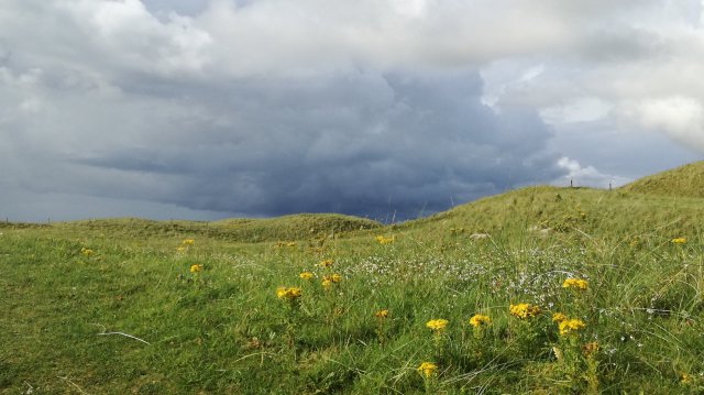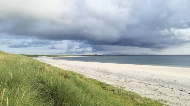 We parkeren de auto op de machair bij het kerkhof van Dalabrog. We wandelen door een duingebied richting het strand. Een mooie zandweg slingert tussen de duinen. We zien dat onze was weer nat is geworden, er hangt een enorme bui boven Beinn Mhor!