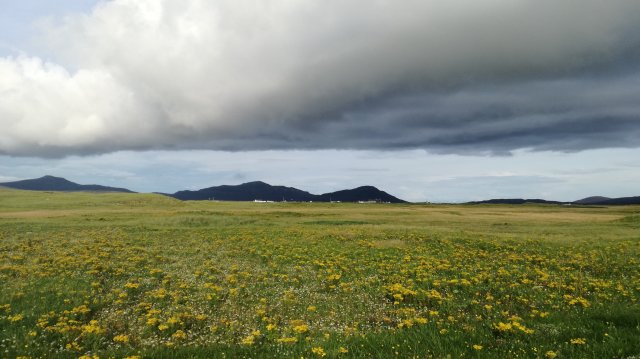 We wandelen weer terug door de duinen naar de auto. Overal bloeit jacobskruiskruid, maar we zien ook knoopkruid, gele viooltjes, kamille, ogentroost enz. Een crofter heeft zelfs een veldje aardappelen geplant!