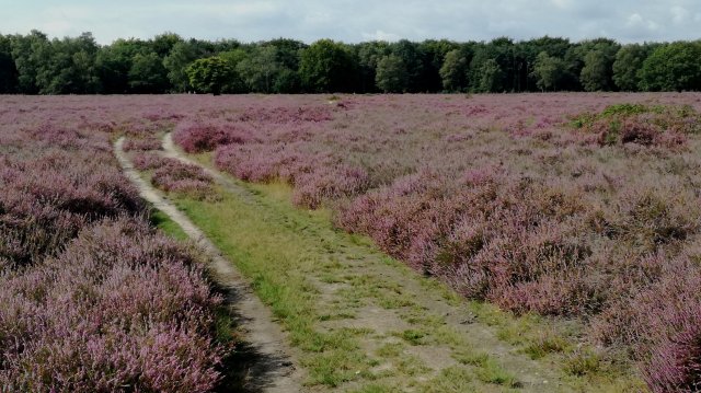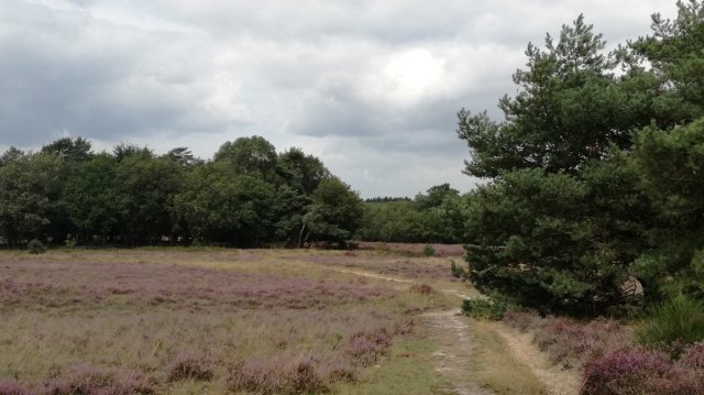 Het zal tegen elven zijn als we de auto parkeren onder een hoge beuk, in een zijweg van de N527 die van Bussum naar Huizen loopt. Aan de andere kant van de weg strekt zich de Blaricummerheide uit (althans wat er van over is gebleven…). We openen het klaphek en begeven ons op weg. Vanaf wandelzoekpagina.nl heb ik een topografische kaart geprint (Trage Tocht Blaricum) waarmee we goed uit de voeten kunnen om onze eigen rondje uit te stippelen. De heide staat er dit jaar op de meeste plaatsen goed bij! En… met enige regelmaat schijnt de zon. Tja, dan is het gewoon ogen open en genieten maar!