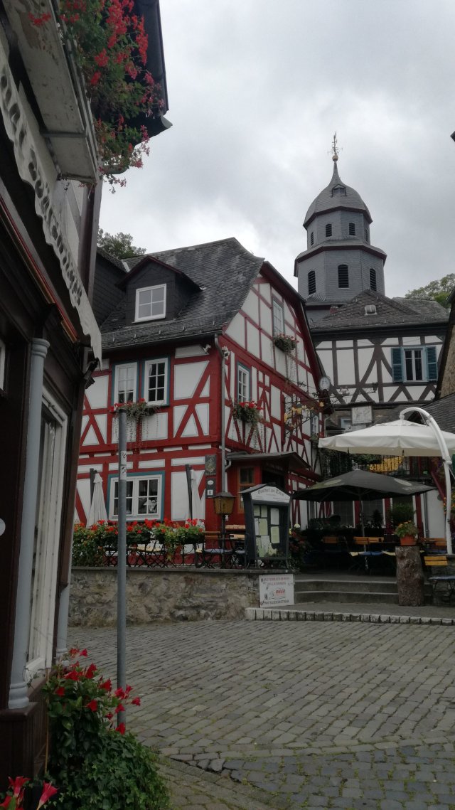 We lopen Braunfels in. Het dorp ligt onder het kasteel en ziet er charmant uit. Smalle straatjes, een fraai dorpsplein, mooie winkeltjes, gezellige terrasjes en heel veel vakwerkhuizen…