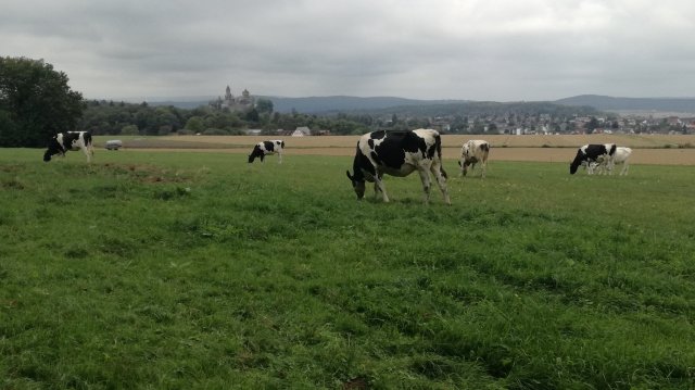 We verlaten de aangegeven route. De weg stijgt en uiteindelijk staan we bij de bosrand waar achter schrikdraad een klein groepje zwartwitte koeien staat te grazen. Aan de horizon zien we de torens van het kasteel van Braunfels. Sprookjesachtig ziet het er van hier uit!