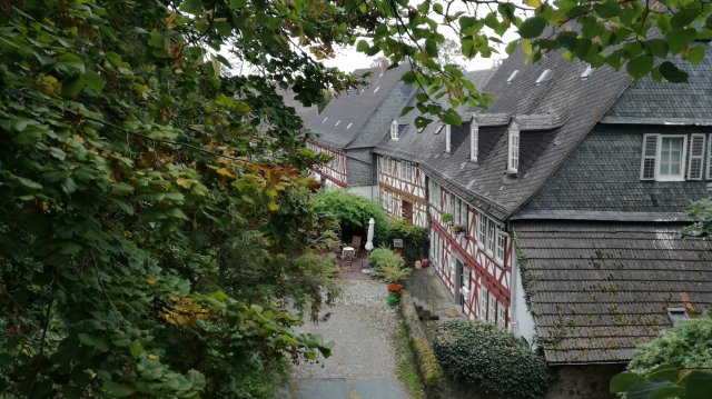 Mijn rondje betreft de wandeling naar de bakker (en de supermarkt) – en terug. Na het ontbijt met vers gebakken Backhaus Brot, belegd met Edelsalami en weggespoeld met een paar mokken Keniaanse thee uit Kericho, rijden vrouwlief en ik via Wetzlar naar Braunfels, waar we parkeren aan de voet van de heuvel waarop een prachtig kasteel staat.