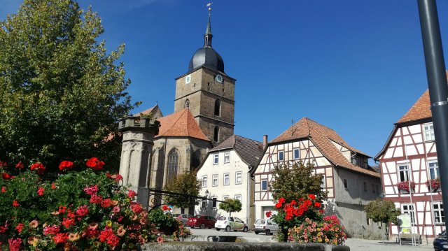 Ten slotte arriveren we weer in de bewoonde wereld: Heldburg, waar de auto staat. In het dorp is het nog steeds rustig, maar langs de weg die er omheen loopt, staan honderden auto’s geparkeerd van bezoekers aan het Middeleeuwse feest bij het kasteel.