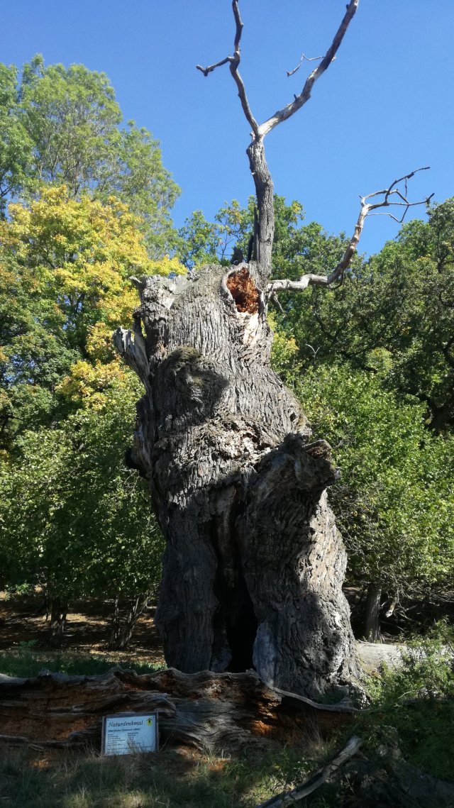 Op het bordje staat dat deze eik tussen de zes- en achthonderd jaar oud is. Veel leven zit er niet meer in maar een ding is zeker: dit is een indrukwekkende boom (geweest). Het besef dat er ergens in de 13de of 14de eeuw uit een eikel zulk een boom is gegroeid, stemt tot nadenken en dwingt respect af voor de kracht van de natuur… Wat heeft zo’n boom allemaal niet gezien…!?