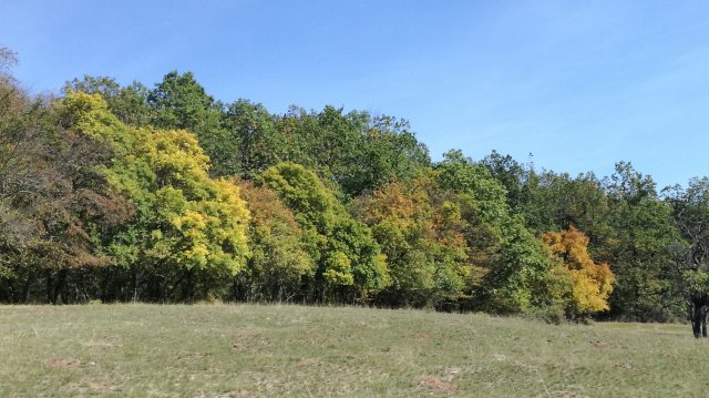 De wandelroute die we volgen loopt door mooi loofbos over de heuvelrug. Een wegwijzer naar een 1000 jaar oude eik lokt ons van de bosweg af, over een oud ezelpad tussen hoge bomen dalen we af.