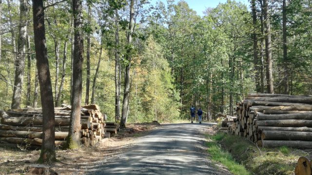 We steken de grote weg over waar verkeersregelaars staan – waarvoor!? geen auto te bekennen. Door het bos lopen we omhoog. Ik vind dat er best al herfstkleuren te zien zijn.