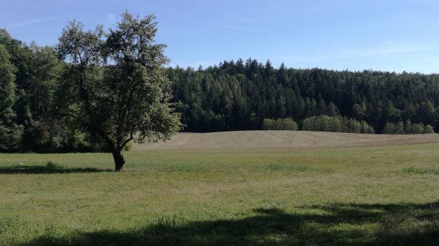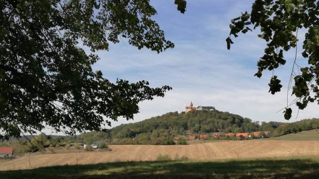 We lopen verder. De weg is vrij breed maar onverhard. In het begin loopt hij redelijk parallel met de bosrand. Op de helling groeien oude fruitbomen. We hebben een terugblik op het kasteel.