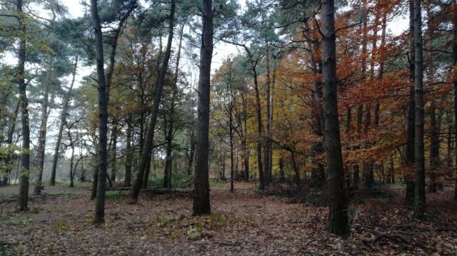 Programmapunt 5. We trekken de wandelschoenen aan en lopen de bossen in. Al gauw komen we er achter dat er gejaagd wordt! Het bos is afgesloten, we mogen alleen de wegen volgen waar de ‘rode wandeling’ loopt. Alweer pech! Gelukkig komt de zon er door. Er staan nog heel wat bomen in blad, met mooie herfstkleuren!