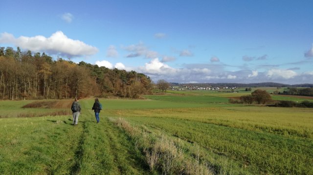 Vanaf de grote weg staat de wanderparkplatz goed aangegeven. Vanaf de parkeerplaats lopen we langs een veldweg naar de rand van het bos. De route volgt de bosrand, meestal letterlijk, soms snijdt ze een hoekje velden af en doorkruist ze een stukje bos. Alles bijeen zijn het 9,3 aangename kilometers, precies wat mijn rug goed aan kan…