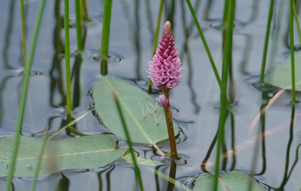 Veel van de akkertjes die eind maart, begin april nog meertjes waren, zijn drooggevallen: het grondwaterpeil zakt! Al die kikkers die wij hier, nog geen maand geleden, een concert hoorden geven en duizenden dikkopjes hebben voortgebracht: wat is er van hen geworden? Even verderop ligt het grotere meer aan de rand van De Bleek, achter het Sint Liobaklooster. Hier is het gekwaak niet van de lucht. In het water groeien tal van planten waaronder waterranonkel en de plant die je hieronder op de foto ziet: veenwortel.
