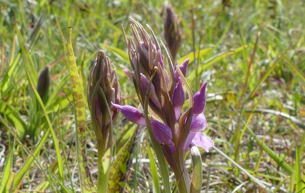 We naderen het einde van de wandeling. Het duinmeertje bij de kruising van de fietspaden is de afgelopen weken ook flink kleiner geworden, maar de kikkers verraden dat er nog water is en ook het riet geeft aan dat dit gebiedje bijna altijd vochtig is. Vorig jaar, aan het einde van de zomer, bloeide hier de parnassia. Nu komen de rietorchissen voorzichtig open en staat de ratelaar in bloei: beide liefhebbers van een vochtige leefomgeving.