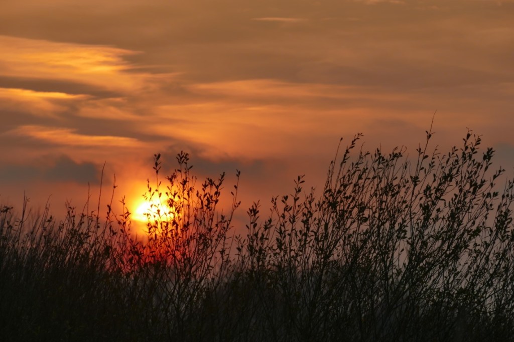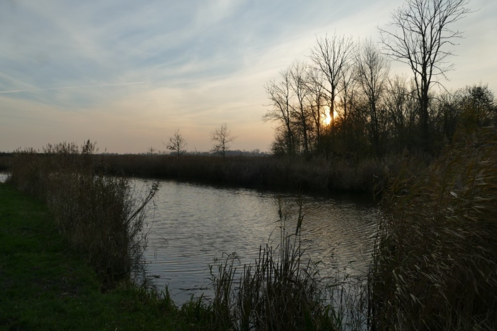 Woensdag 25 november. Een dag waarop de zon priemt door hoge sluierbewolking en de temperatuur in Noord-Holland niet boven de 10 graden uitkomt. Een dag die begint met ochtendrood – maar er valt geen water in de sloot. Wel komt er aan het einde van de middag van op zee bewolking aanzetten en vergrijst het licht in slow motion, tot de zon achter de wolken zakt en pasteltinten de lucht kleuren.
