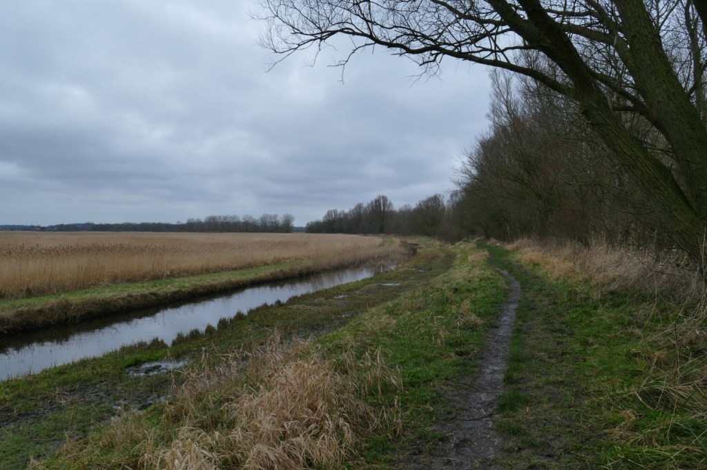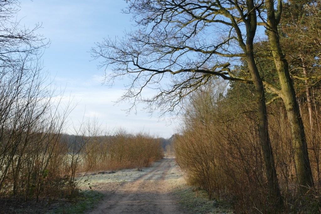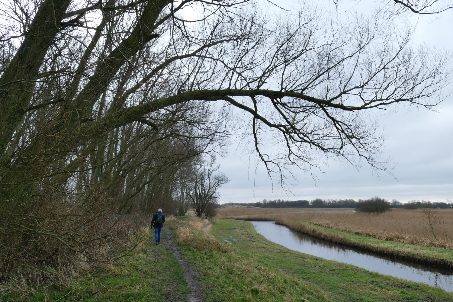 Zaterdagochtend. Ik sla hoopvol de gordijnen open maar helaas: amper wit. De ruiten van de auto zijn berijpt en hier en daar ligt er ook wat rijp op het gras. Op de sloot geen spoortje van ijs. De lucht is egaal grijs. Als ik mijn neus buiten steek, merk ik echter meteen dat het wel écht koud is, met dank aan het oostenwindje dat dunnetjes waait. Na het ontbijt rijden we naar het Geestmerambacht en maken er een kort rondje. De paden zijn buitengewoon modderig en op sommige plekken staat het bos dras.
