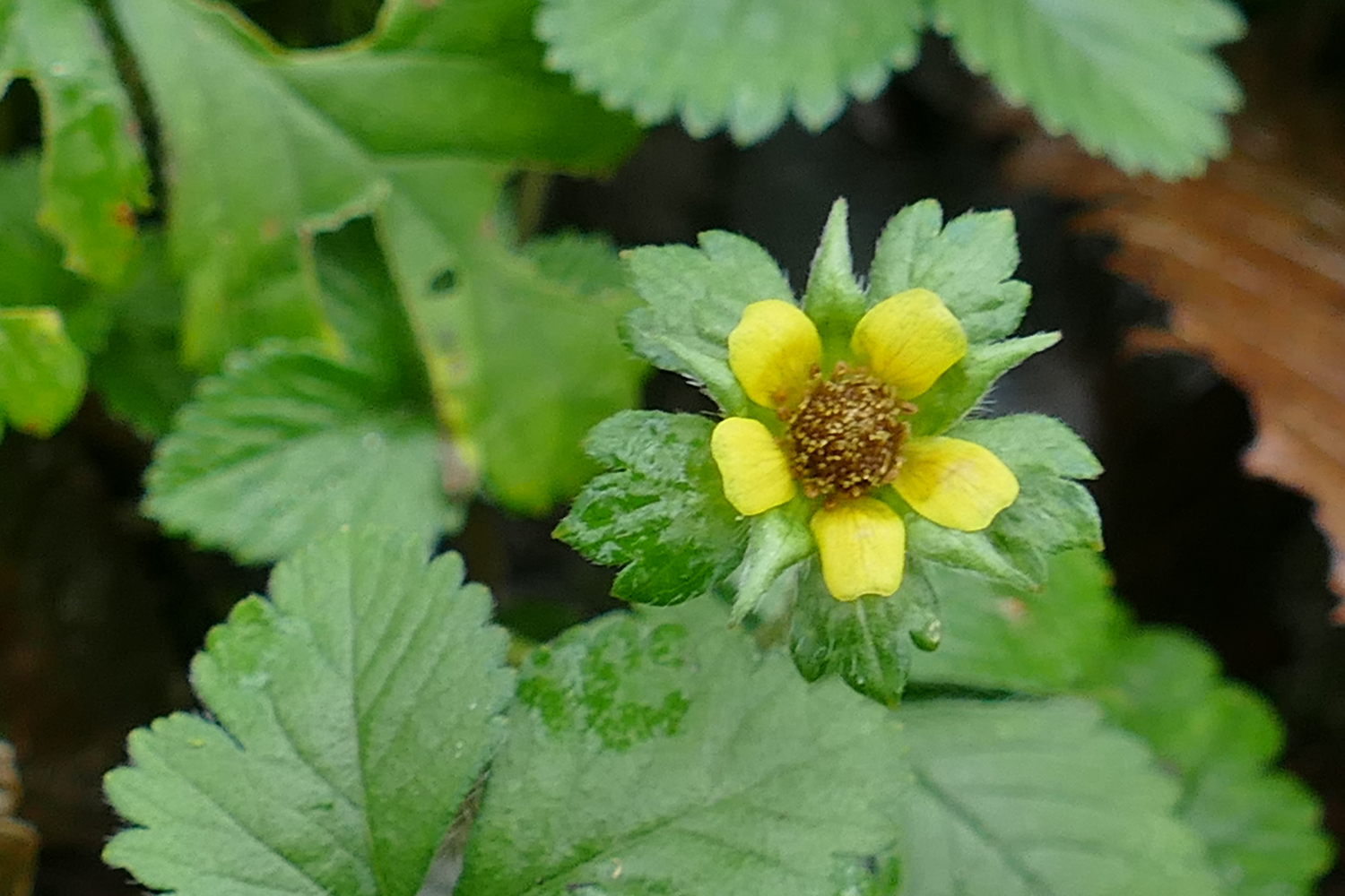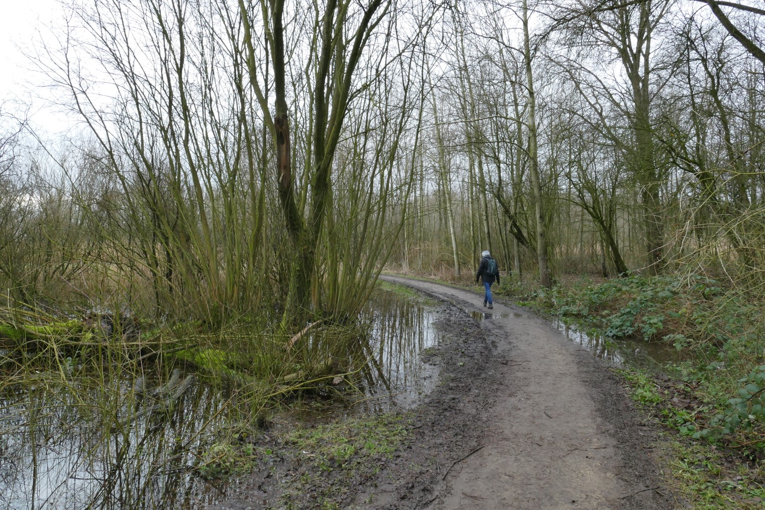 We lopen een stukje langs het water, om de vermaledijde heuvel heen, en kiezen dan de beschutting van ‘het bos’. Op sommige plaatsen ligt het pad net hoog genoeg om de voeten droog te houden… En waarachtig: we vinden kleine, gele bloemetjes die al (of nog?) staan te bloeien!