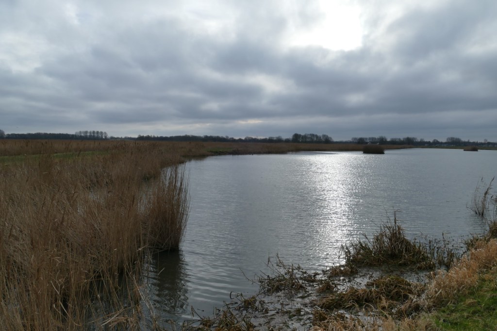 Weer bij de auto gekomen, besluiten we nog door te lopen naar de plassen van de nieuwe Kleimeer. Er is daar op het water niet veel vogelleven te bespeuren (op een groepje bergeenden na), wel zitten er veel vogels op de weilanden…